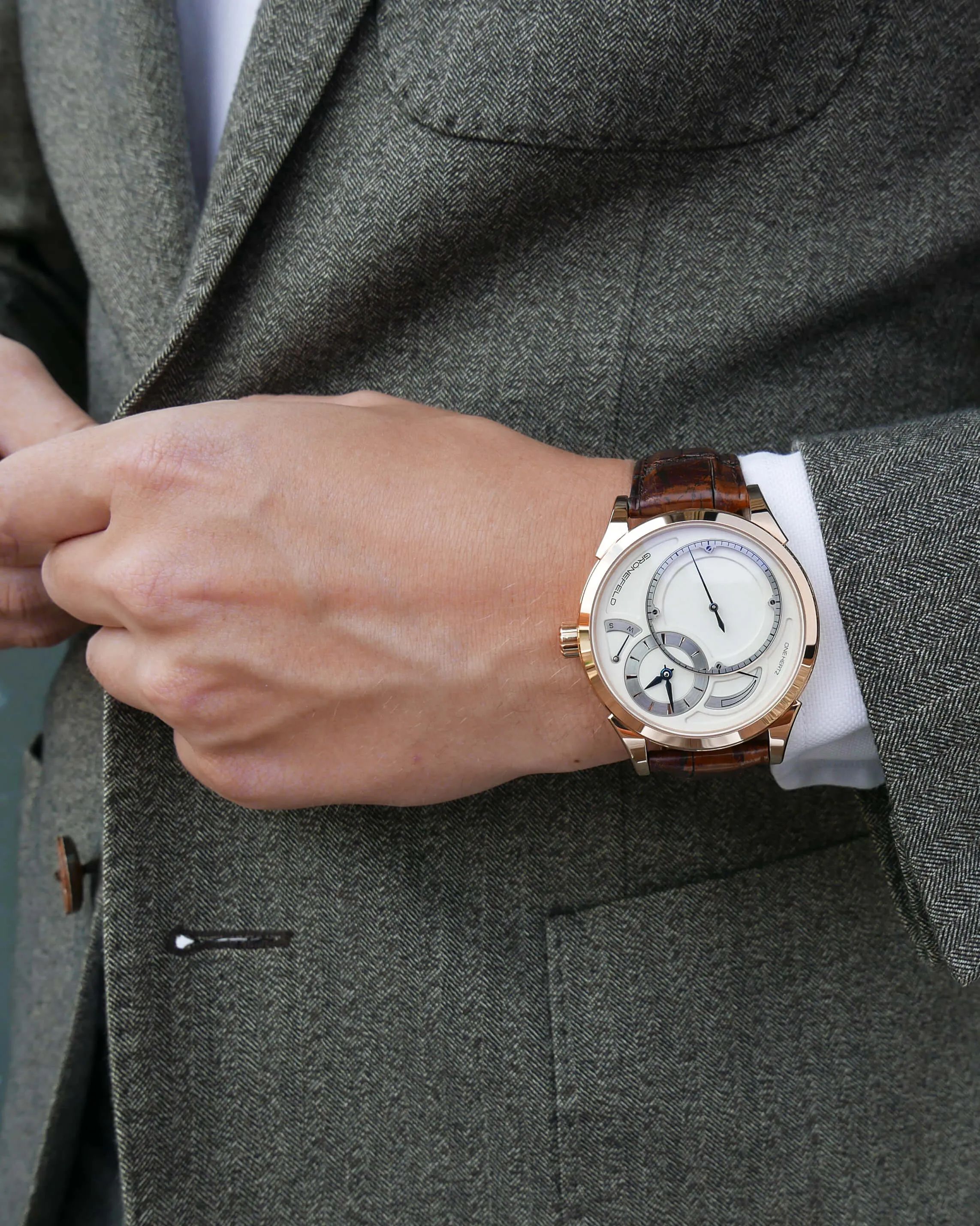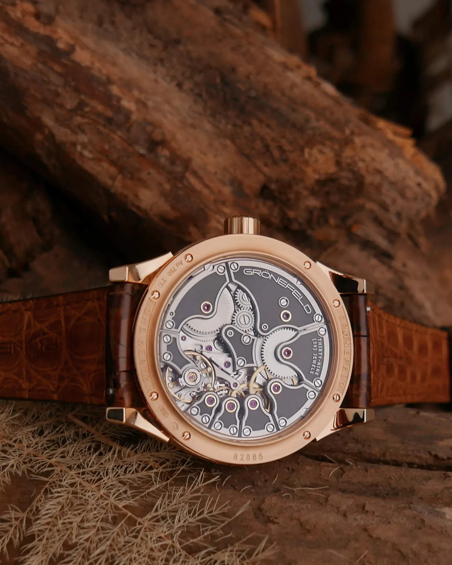 The Grönefeld One Hertz is the world's first and only series wristwatch with independent dead seconds. It features a beautiful solid silver dial and an entirely in-house developed movement with stainless steel bridges and exceptional fine finishing. Dead seconds is where the second hand advances in full steps of one second instead of the usual smooth sweeping action of mechanical seconds. With the One Hertz, Bart and Tim Grönefeld have resurrected this long-neglected horological complication and re-positioned it on the pedestal of high precision. Until the arrival of the One Hertz, dead seconds – secondes mortes in French – in wristwatches was usually derived from constant force devices. The Grönefeld One Hertz is unique among wristwatches in that to maximize precision, its dead seconds are powered by a secondary gear train, independent of the gear train for the hour and minute indications.