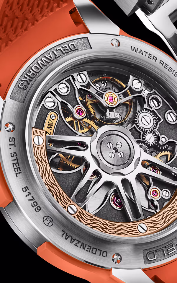 A triple-seal, screw-down crown mitigates the risk of dust or water ingress. In addition, the crown features an ingenious safeguarding system. When the Grönefeld logo on the crown is perpendicular to the dial and pointing upwards, the triple-seal, screw-down crown delivers maximum protection. To reduce the load on the ceramic ball bearing of the DeltaWorks’ oscillating mass, Grönefeld has extended the four steel spokes beyond the 18K gold mass. In the event of an extreme impact, these protruding spokes will tap against the middle-case or the inside of the rear cover. This ensures that the impact is not transmitted directly to the ball bearing and helps maintain its durability. The sapphire crystals, to the front and rear, are thicker than normal and, by default, stronger. As a result of the aforementioned details, the watch is water resistant to 100m, making it suitable for an array of leisure pursuits, including swimming, sailing and windsurfing.