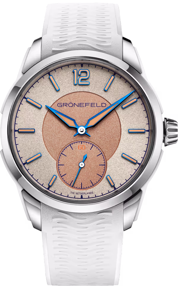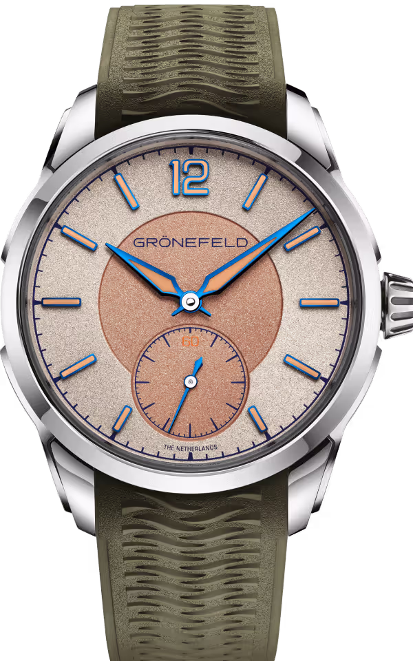 The aforementioned pane of sapphire crystal, positioned to the rear of the watch, affords views of the beautifully appointed, self-winding movement. The case back features ‘GRÖNEFELD’ and ‘DELTAWORKS’ in relief, while the name ‘Oldenzaal’ is discretely engraved opposite the crown, an elegant reminder of where the Grönefeld family’s watchmaking story began.