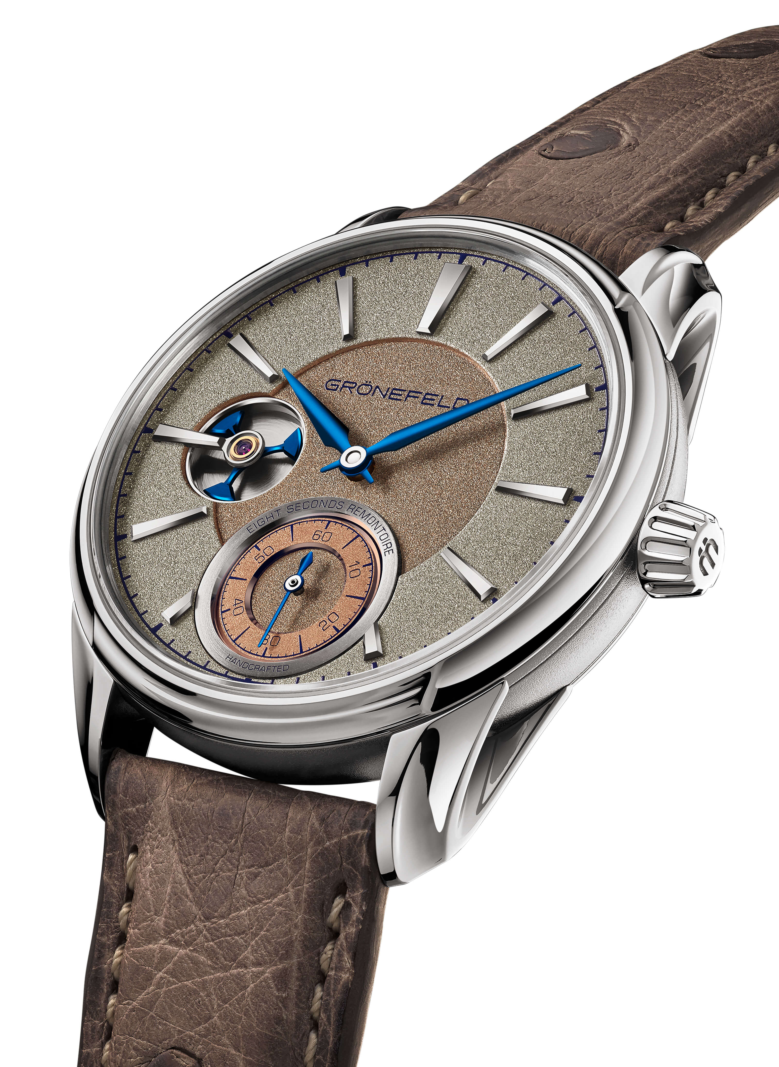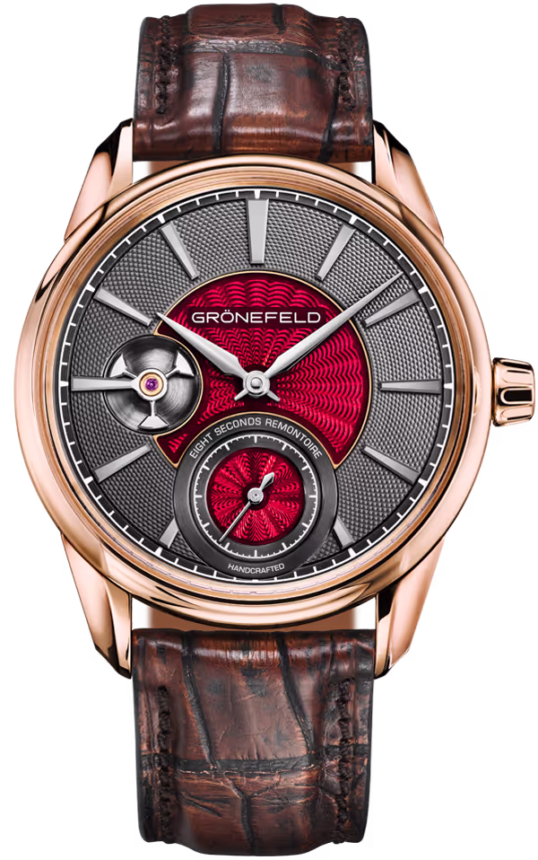 Relief engraved Grönefeld logo, number of jewels and eight seconds remontoire