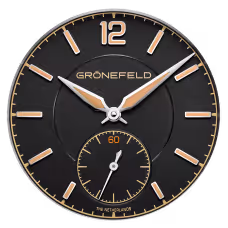 The Grönefeld 5-arm, double spoke gear train wheels exhibit a contemporary character, but their circular grained surfaces pay due reverence to fine watchmaking tradition. Their design, as well as the bevelled escape wheel teeth, prevent the oil from dissipating, thereby mitigating wear. The free-sprung balance mitigates positional influence and delivers superior rate stability. The escapement is adjusted to heat-cold, isochronism and six positions.