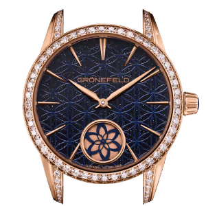 The dial of the 1944 Tanfana is formed of aventurine, a glossy midnight blue material incorporating numerous glinting metallic inclusions. Its geometric motif, known as the ‘Flower of Life’, enhances the dial's visual depth and texture. This pattern is linked to Sacred Geometry, an ancient discipline that explores the spiritual meaning of shapes and proportions often found in nature.