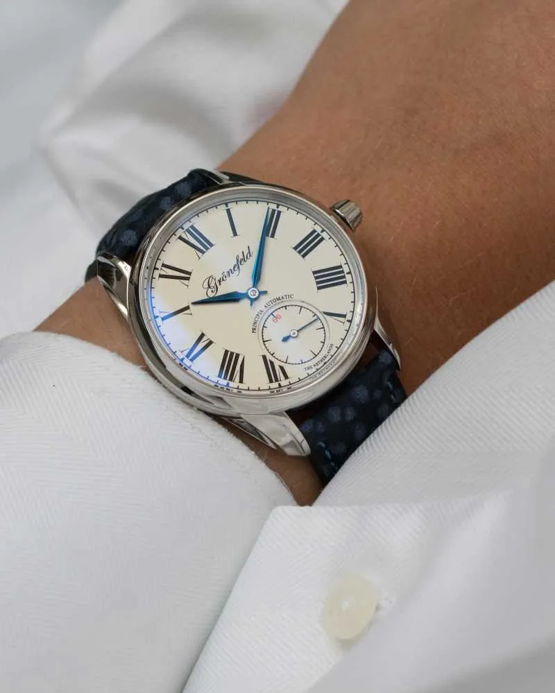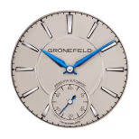 The Grönefeld 1941 Principia Automatic is offered with an array of dials, all crafted in solid sterling silver. The would-be wearer can choose from a cream lacquered dial with roman numerals, a refreshing matt turquoise or light blue dial with polished applied baton hour markers. Alternatively, the company's rhodium plated or gold plated salmon dials are also available.