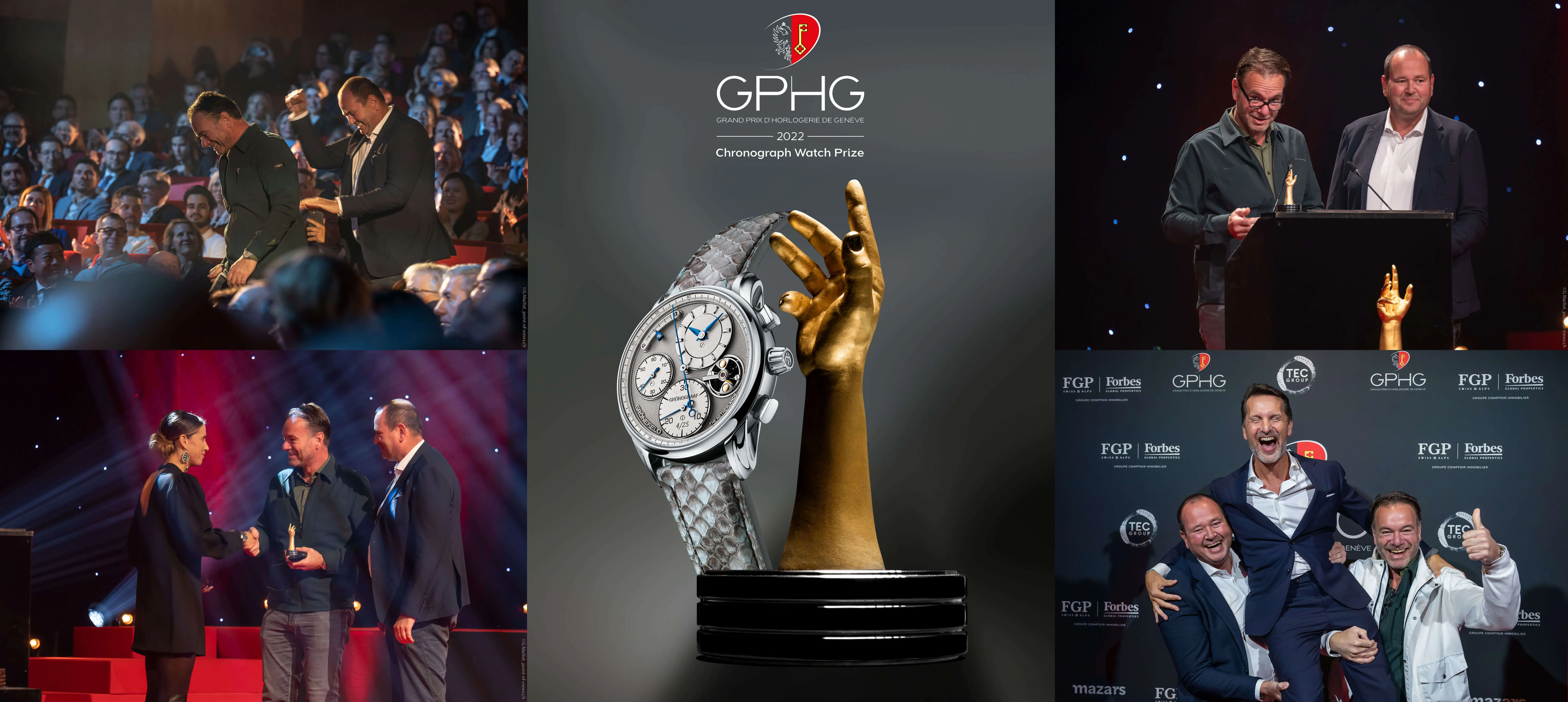 Great news from Geneva: 9 November 2022 The Horological Brothers Bart & Tim Grönefeld were honoured to receive the prestigious Grand Prix d'Horlogerie de Genève in the Chronograph category for the 1941 Grönograaf!