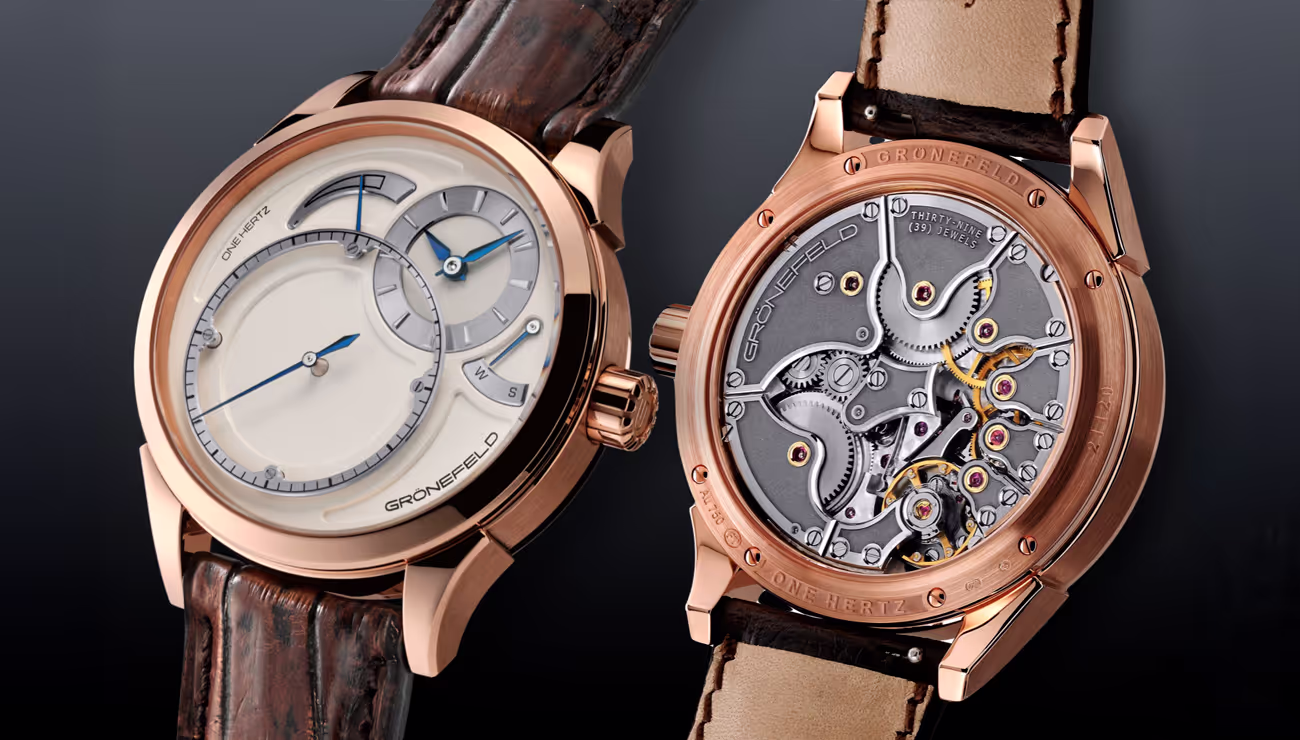 The One Hertz is the world's first wristwatch with an independent jumping seconds mechanism. The One Hertz was awarded Watch Of The Year by timezone.com, a leading website for wristwatch collectors and enthusiasts.